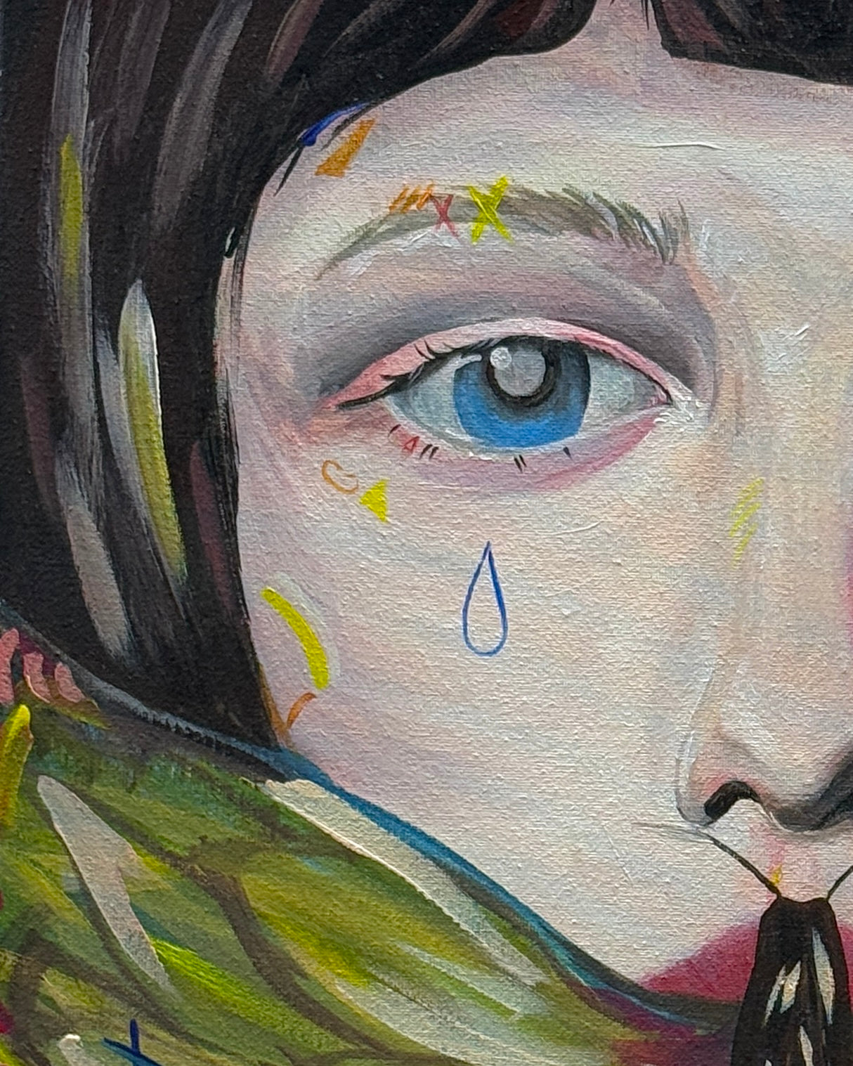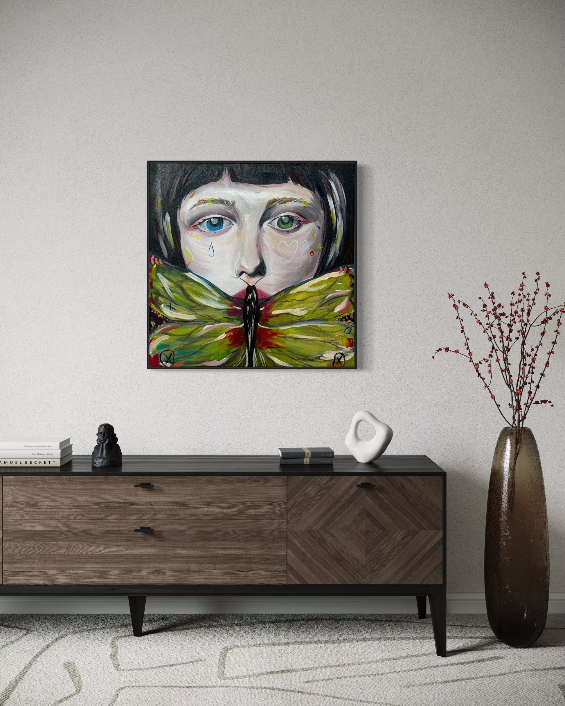 Unspoken was painted at a time when I couldn’t find the words for what I was feeling. The butterfly over the mouth is about silence, chosen or forced, and everything we keep inside. The mismatched eyes, the symbols, the colors… they all came out naturally, like my emotions painting themselves.