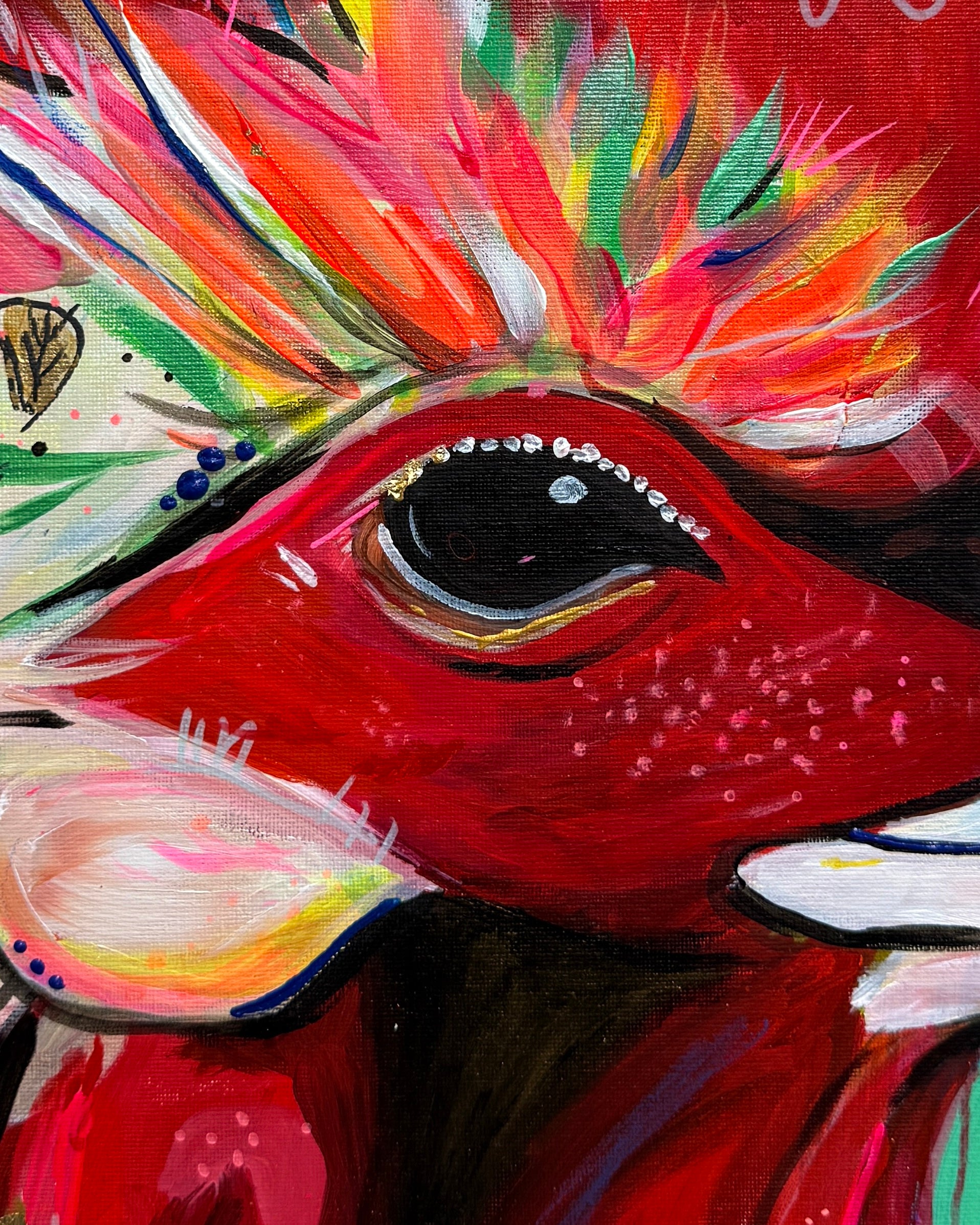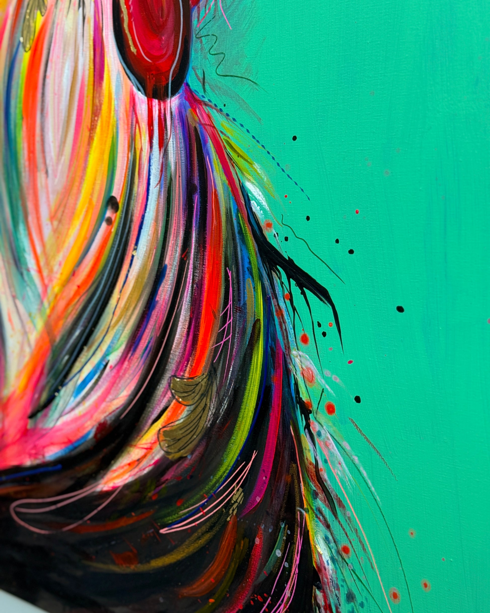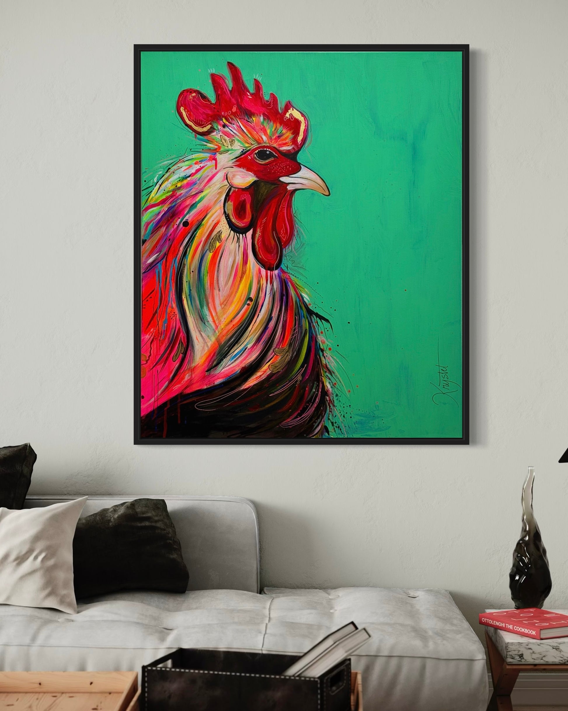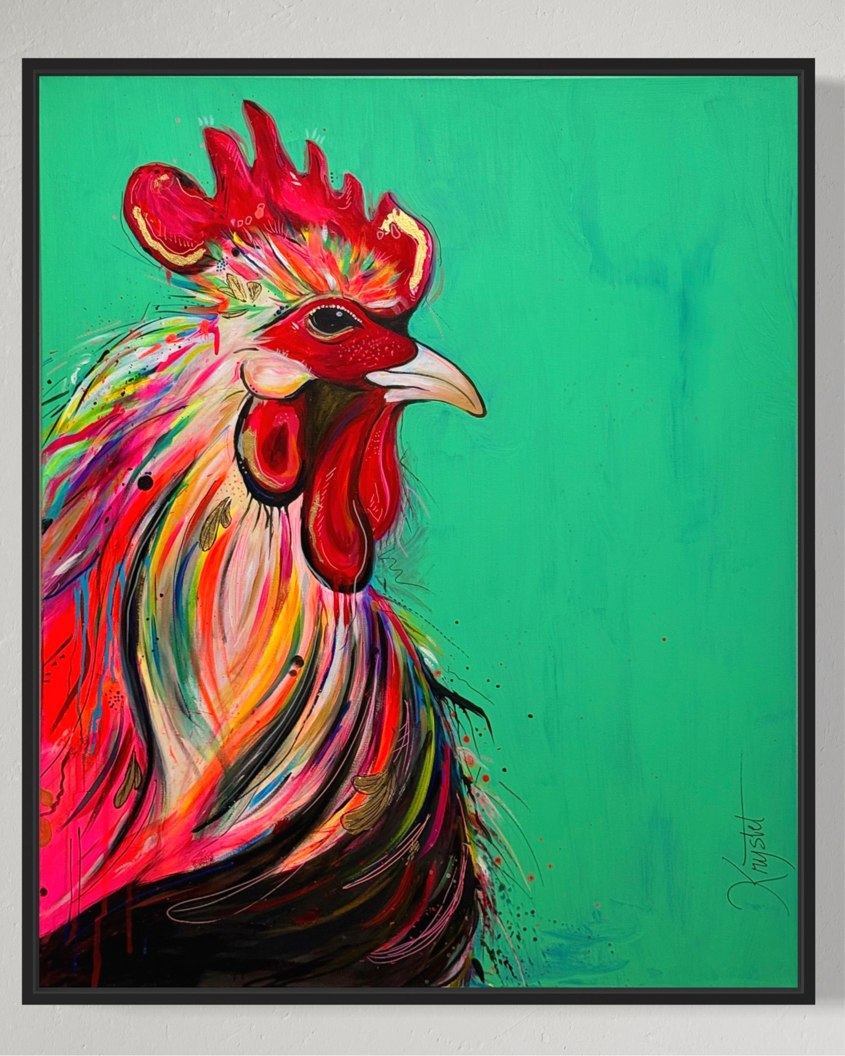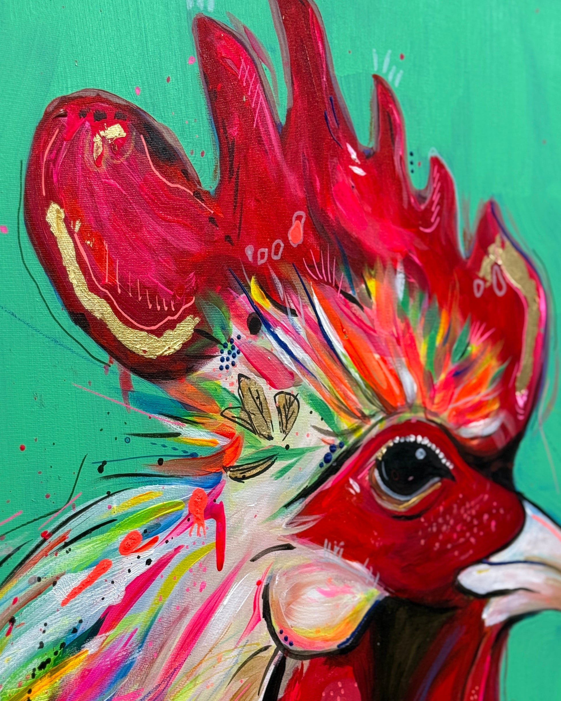 Koko-Riko, the morning drama started as a joke in my head, that over-the-top energy some mornings have, when everything feels louder than it should. I wanted to paint a rooster that wasn’t just waking up the house, but making a whole scene about it.