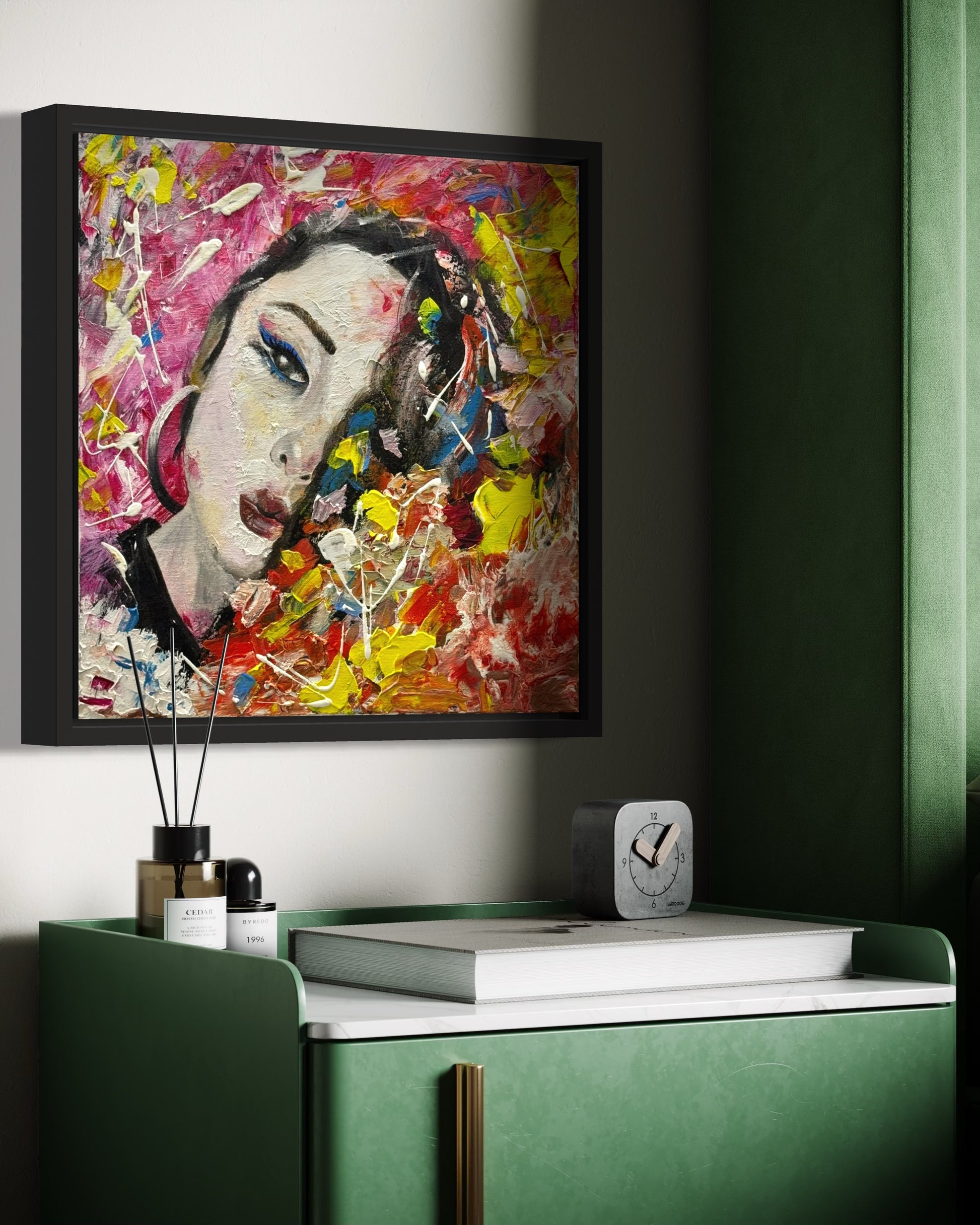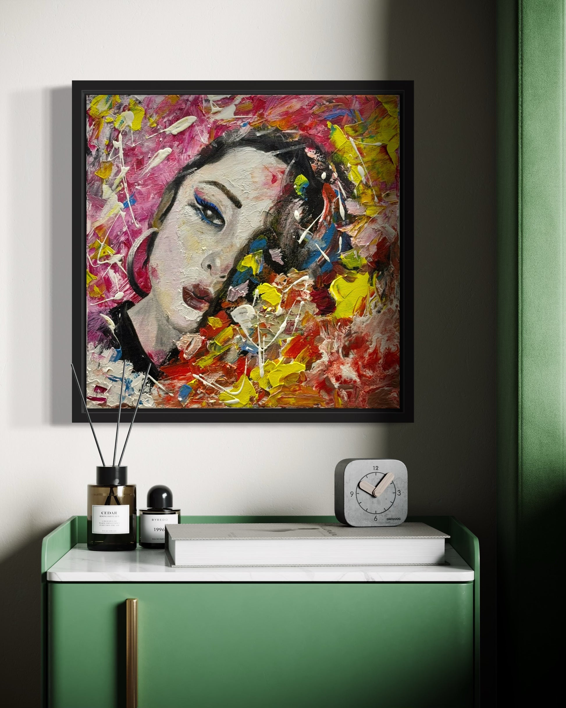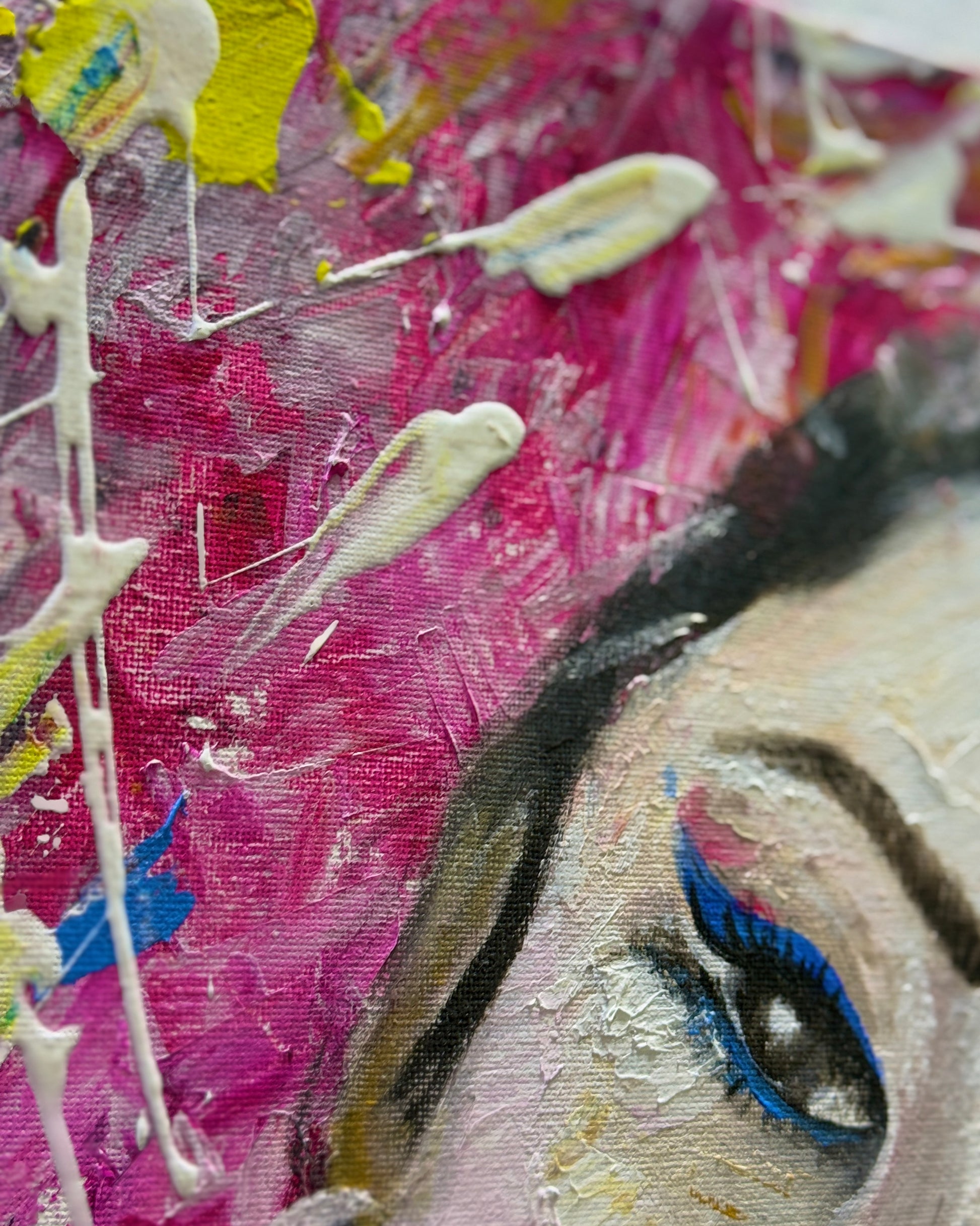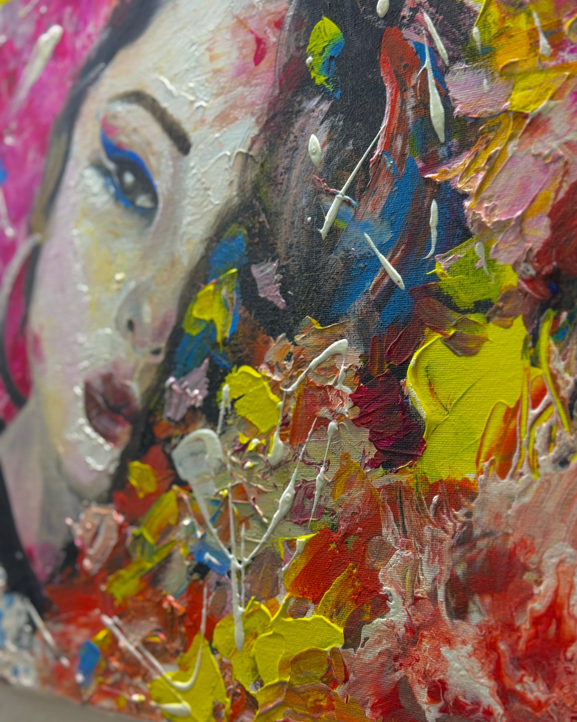 Undone and Alive is one of the first pieces I painted when I was younger. I wasn’t thinking too much. I just followed the colors and let the energy guide me. The face came through the chaos naturally, like it was always meant to be there.
