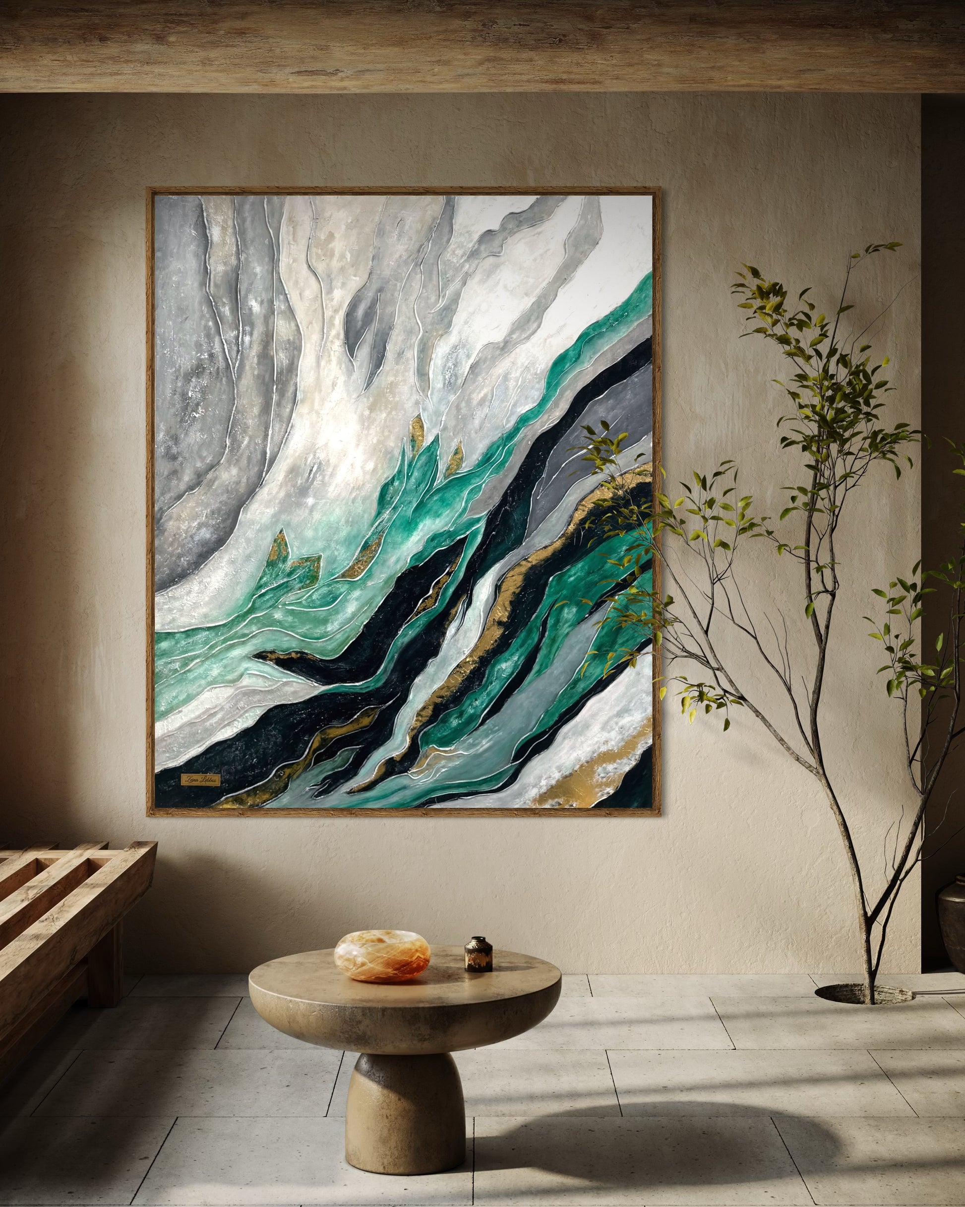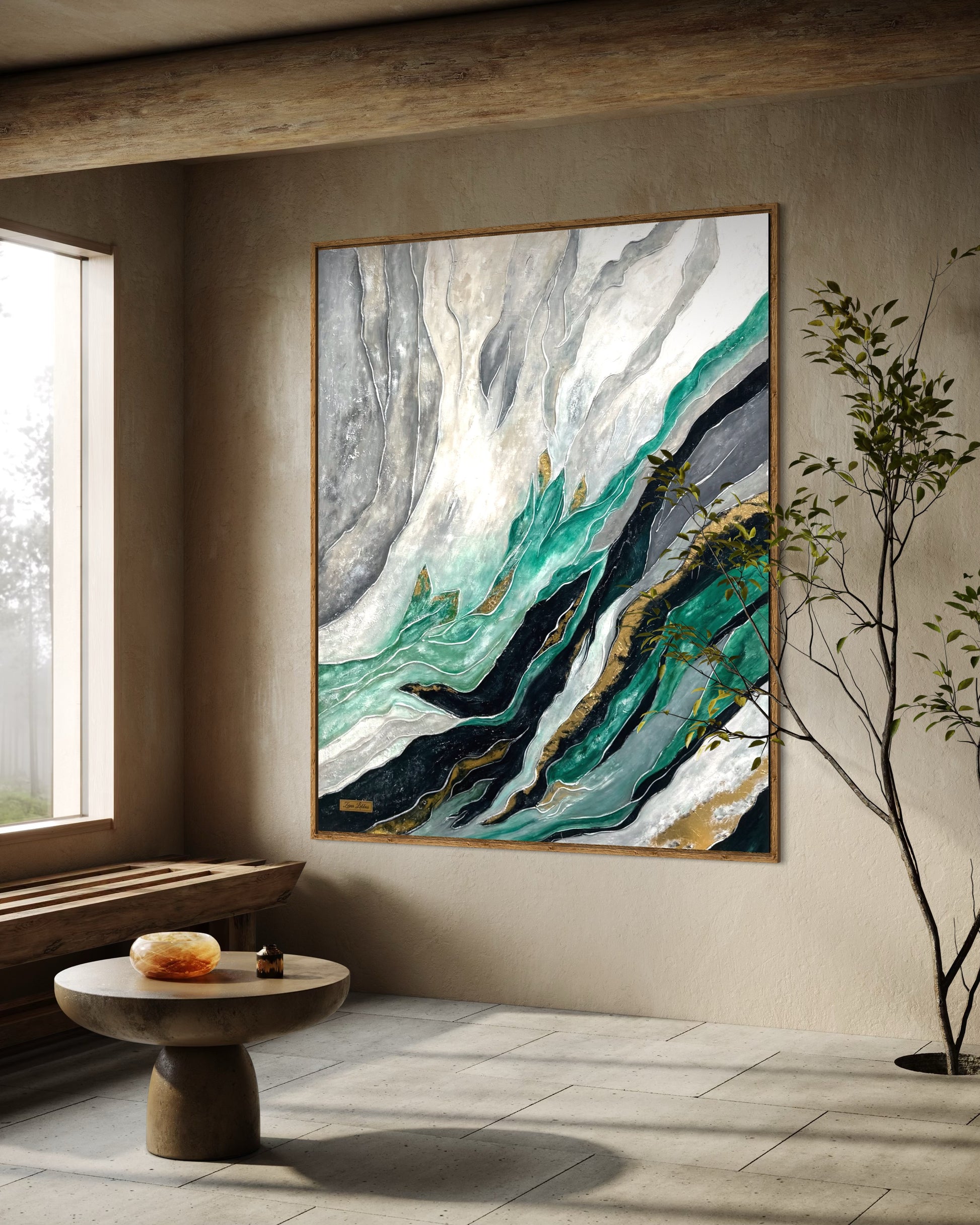 A wave of green, gold, and slate sweeping through like nature caught mid-breath. Verdant Drift feels alive, textured, wild, and grounded all at once. It brings the energy of a landscape without saying a word.